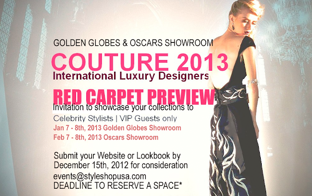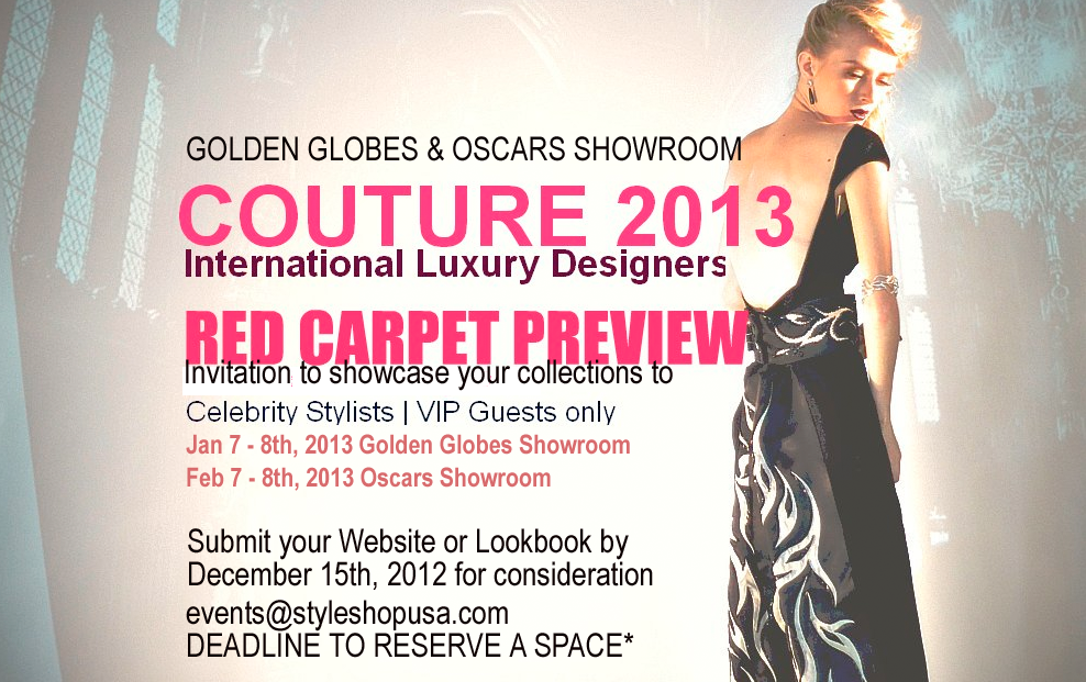 IF YOU WOULD LIKE THE OPPORTUNITY TO BE SELECTED TO SHOWCASE IN OUR RED CARPET STYLE SHOWROOMS FOR GOLDEN GLOBES, OSCARS AND CANNES THEN SEND IN YOUR LOOKBOOKS AND WEBSITES BY DEC 12th.