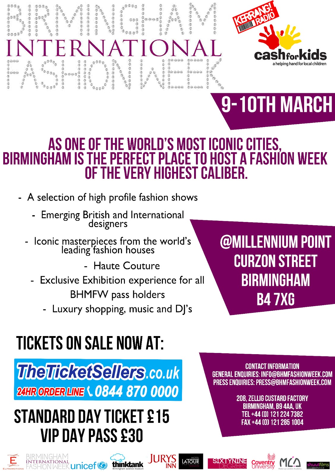 Enjoy a chat with the lovely Miss Birmingham 2013 Rachel Barker and watch the winner of ‘Face of the World’ being announced live on the Saturday! Various performers, artists and bands will be keeping you entertained whilst you are shopping for some unique goodies between runway shows. Make Up London Academy will be offering complimentary make overs for our visitors and Vita Liberata Celebrity Fake Tan will be keeping you nice and bronzed by offering the event goers a free spray tan. Each ticket holder will receive a luxury VIP Gift Bag and a glass of champagne on arrival.